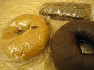 写真左上から時計回りにマフィン(クランベリーホワイトチョコ)、ベーグル(もち)、ベーグルラスク(ローストオニオン)。